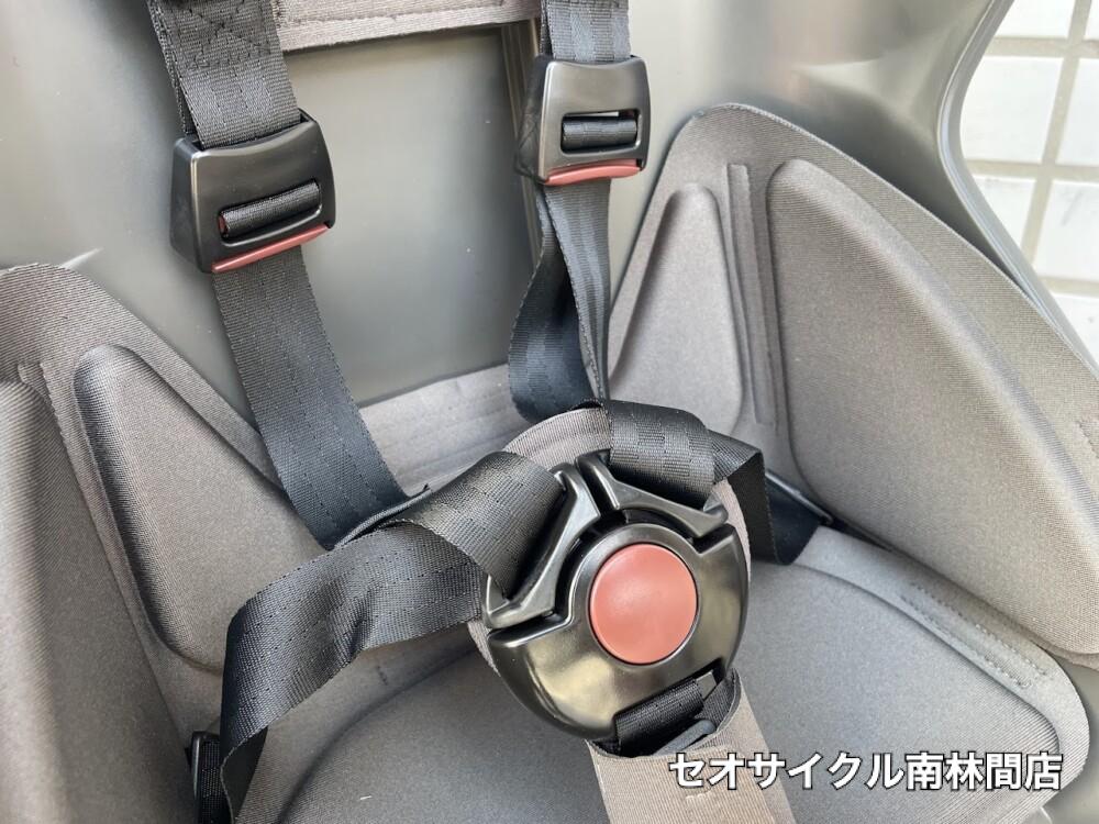 バックルやベルト調整に赤いボタンが目印です。
